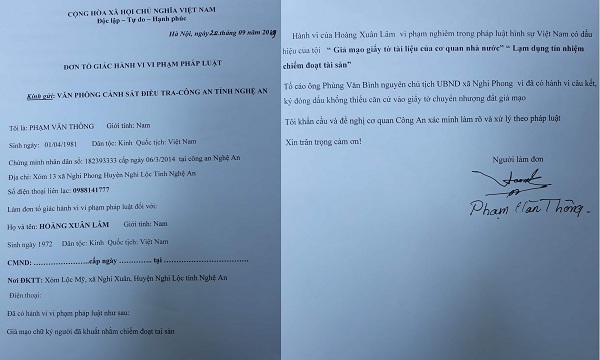 “Thứ nhất là tố cáo ông Hoàng Xuân Lâm với hành vi giả mạo hồ sơ, giấy tờ, giả mạo chữ ký của người khác nhằm chiếm đoạt tài sản. Thứ 2 là tố cáo ông Phùng Văn Bình, nguyên Chủ tịch UBND xã Nghi Phong vì đã cấu kết, ký, đóng dấu khống, thiếu căn cứ vào giấy tờ chuyển nhượng đất giữa bố anh và ông Hoàng Xuân Sơn” – Anh Thông bức xúc, cho biết.