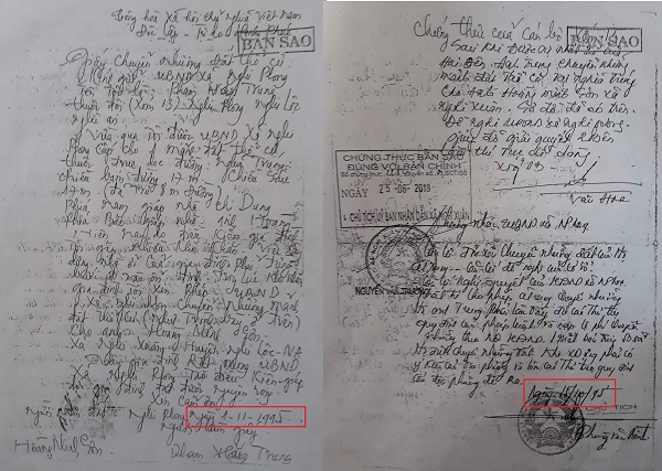 Thứ hai, giấy chuyển nhượng đất nói trên ghi rõ ngày 01/11/1995 nhưng dấu xác nhận của UBND xã Nghi Phong vào biên bản này lại đề ngày 15/10/1995; tức là UBND xã xác nhận vào biên bản chuyển nhượng đất này trước khi biên bản được lập tận hơn…2 tuần? Một sự giả mạo trắng trợn.