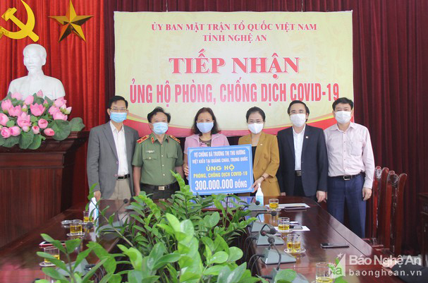 Tại lễ tiếp nhận, Ban Thường trực Ủy ban MTTQ tỉnh đã tiếp nhận 300 triệu đồng ủng hộ của bà Trương Thị Thu Hương, một người con của quê hương Nghệ An đang sinh sống, làm việc Quảng Châu (Trung Quốc).