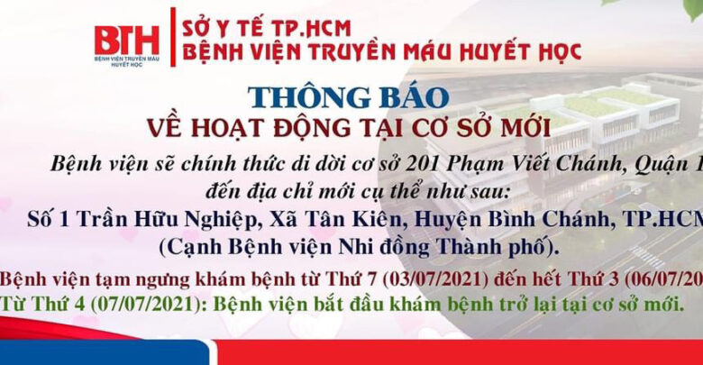 Từ ngày 03/07/2021 đến hết ngày 06/07/2021; Bệnh viện Truyền máu Huyết học TP.HCM (201 Phạm Viết Chánh, phường Nguyễn Cư Trinh, quận Nhất), tạm ngưng nhận bệnh nhấn, dể di dời về cơ sở mới tại Tân kiên – Bình Chánh.