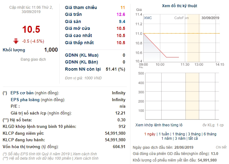Trên thị trường chứng khoán, cổ phiếu XMC tại phiên giao dịch sáng hôm nay 30/9/2019 đẫ sụt giảm 4,5% có giá là 10.500 đồng/cổ phiếu – giảm khoảng 27% so với thị giá hồi tháng 7 và cao hơn 5% giá chào bán cho cổ đông hiện hữu. Tương ứng vốn hóa thị trường của Công ty đạt 604.91 tỷ đồng. Khối lượng khớp lệnh cập nhật chỉ đạt 1.000 đơn vị.
