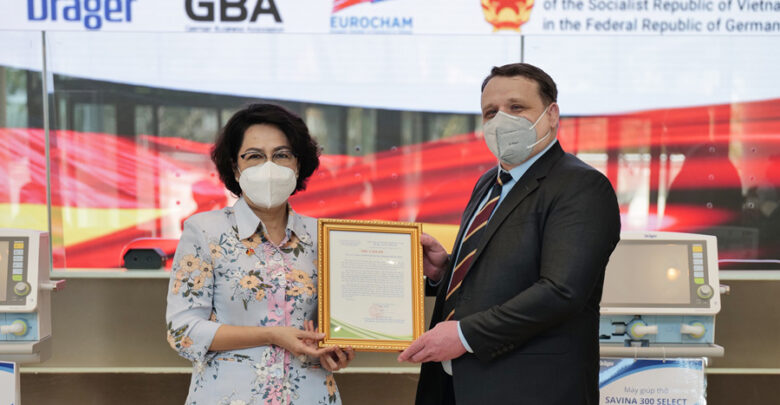 Ngài Sven Eschrich – Phó Tổng giám đốc phụ trách khối sản phẩm mới thuộc Techtronic Industries tại Việt Nam và Phó Tổng giám đốc kiêm Phó giám đốc Điều hành Deutsches Haus – Ngài Elmar Dutt đã bàn giao 15 máy thở chăm sóc chuyên sâu và 30 máy monitor theo dõi bệnh nhân thương hiệu DRAEGER của Đức để đưa vào sử dụng ngay trong các bệnh viện tại TP.HCM.