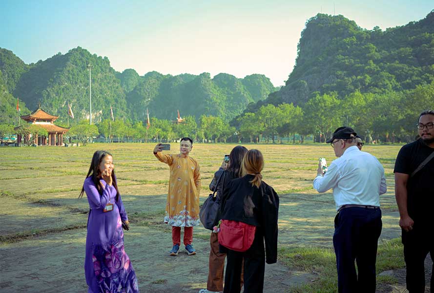 NSND Tự Long đầy hào hứng selfie tại Ninh Bình phía trước núi Mã Yên, là một trong những địa điểm truyền thuyết dân gian nói có một trong 99 chiếc quan tài mộ Vua Đinh.